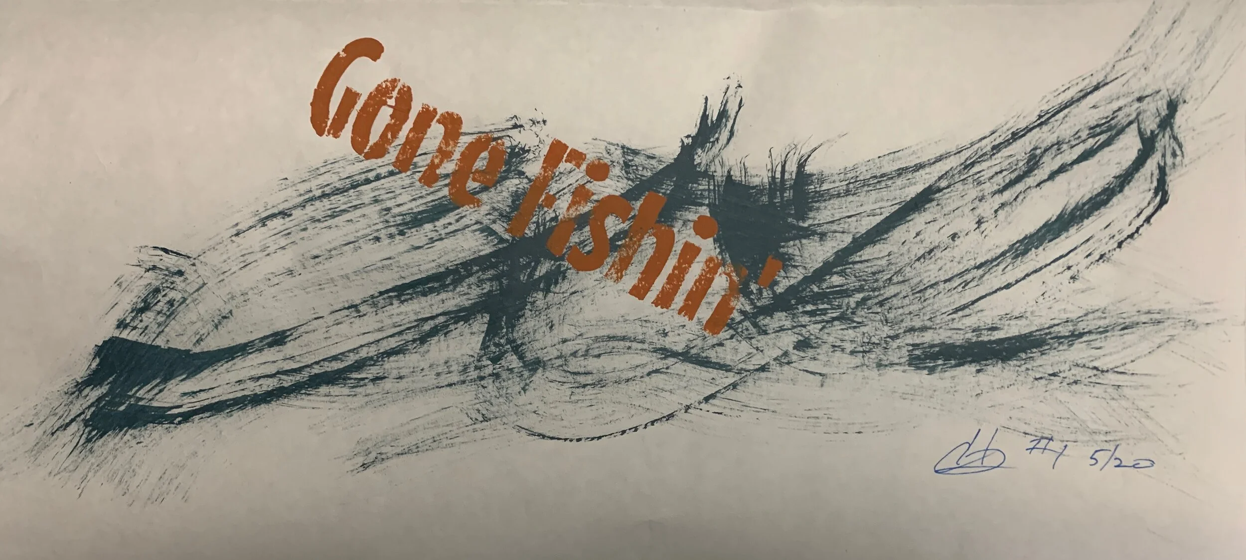 A one of one, for sure. It’s what I used to design the original Gone Fishin’ just sort of scribbled it out with paint on a sheet of white butcher paper that they use to wrap meat, so you can either buy this to frame and hang on your wall as almost art, or turn it over a wrap 3 Delmonico Steaks (I measured). It measures right now at 18x9 inches but it still can be cut down some should you have a weird frame hanging around out in the garage. Signed and dated and Numbered #1. Ships free.