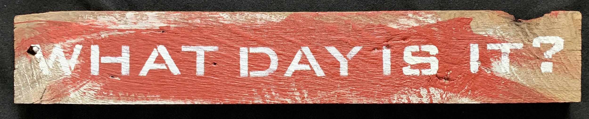 Not only can’t I remember what day it is, I don’t know what MONTH it is. Can never find my keys either, sometimes call one of the kids, “Riley,” our dog, walk into a room and not know why. Those of you who know exactly what I’m talking about will buy this sign, all the young folks…I have some in storage for when your time comes…and it will. Comes from a real old barn somewhere, might have been on the inside of it, or not. They told me something cool about it, but…